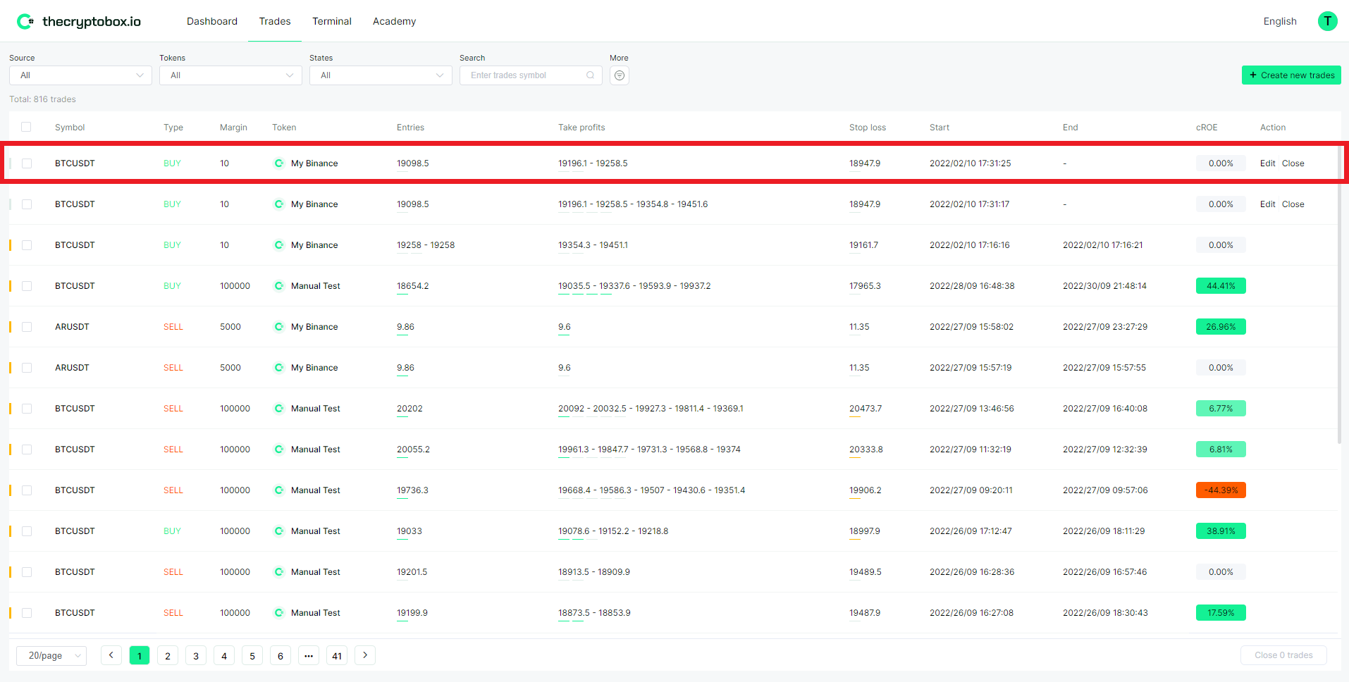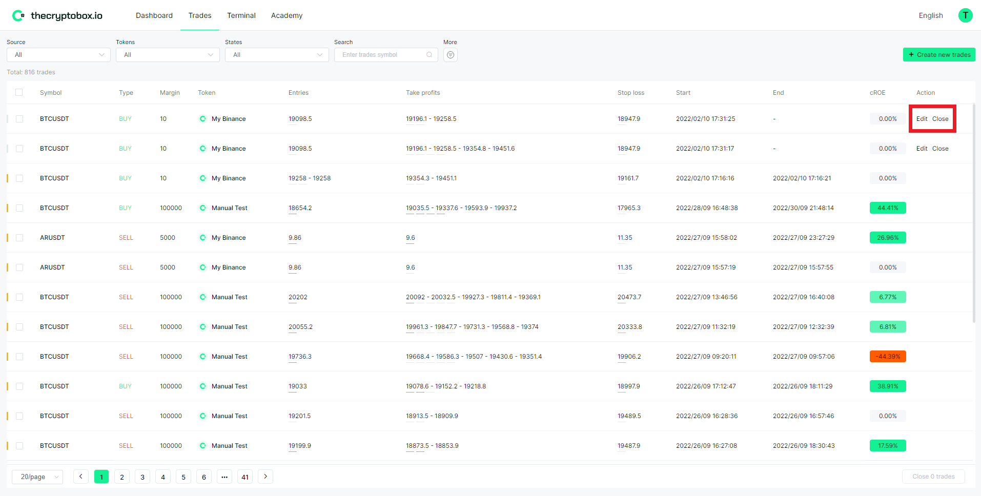 In any case, you can stop your trade by clicking the "Close" button or edit your trade as needed with the "Edit" button which next to the trade information.